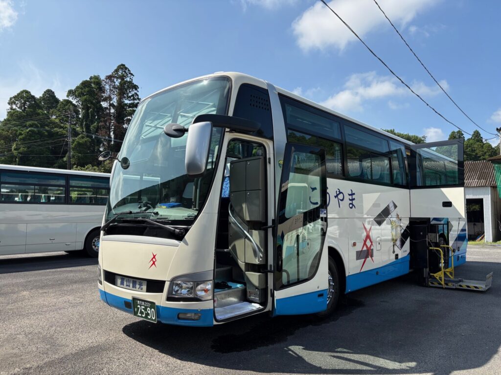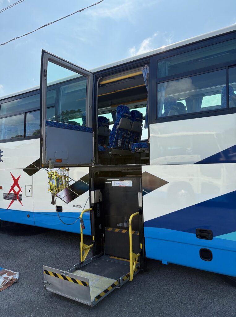 高山観光バスの大型リフト付きバス 2026年03月22日2026年03月22日 桜観光そよ風 全国でも珍しいタイプの三菱ふそう製の大型リフト付きバスです。 車いす6台まで搭載可能ですが、かなり狭くなるので実質は4台までがおすすめです。